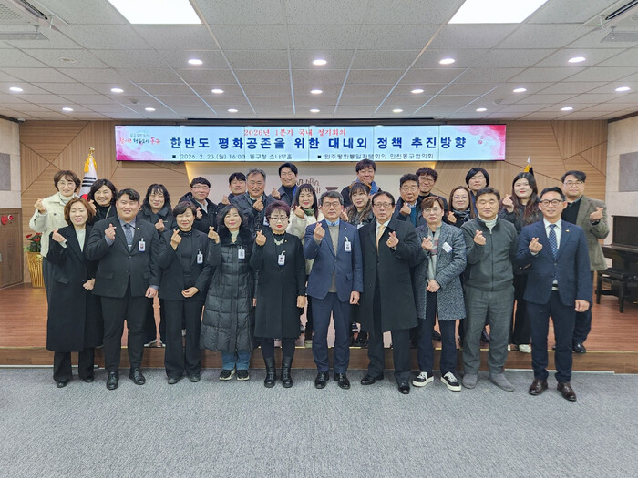 [인천=문찬식 기자] 민주평화통일자문회의 인천동구협의회(협의회장 최현모)는 지난 23일 동구청 소나무홀에서‘한반도 평화공존을 위한 대내외 정책 추진방향’을 주제로 2026년 1분기 국내 정기회의를 개최했다고 밝혔다.