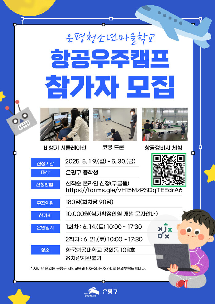 [시민일보 = 이대우 기자] 은평구(구청장 김미경)가 항공우주분야에 관심있는 중학생을 대상으로 운영하는 ‘은평항공우주캠프’ 참가자를 오는 30일까지 모집한다.