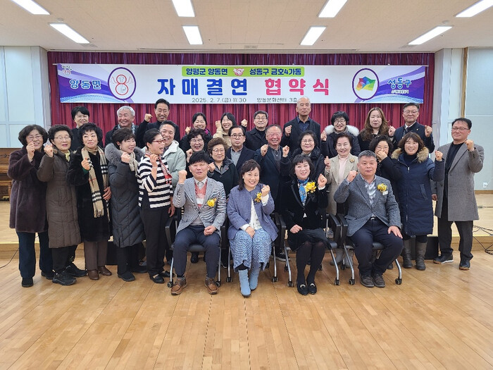 [시민일보 = 박소진 기자] 성동구(구청장 정원오) 금호4가동 주민자치회가 최근 경기도 양평군 양동면에 방문해 주민자치 활성화 및 지역 발전을 위해 양동면 주민자치위원회와 신규 자매결연 협약을 체결했다고 밝혔다.