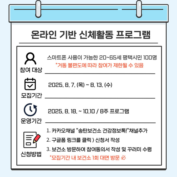 [평택=오왕석 기자] 평택시(시장 정장선) 송탄보건소는 8월 7일부터 14일까지 하반기 ‘온라인 기반 신체활동 프로그램’ 참여자를 모집한다.