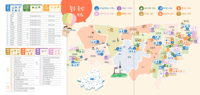 자세한 시설 현황은 구 블로그에서 '중구 공간찾기 지도'를 검색하면 볼 수 있다. 예약은 서울시 공공서비스예약 또는 공공개방자원 나눔터 '공유누리'를 통해 하면 된다.