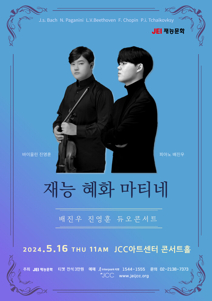 [시민일보 = 여영준 기자] 재능문화는 피아니스트 배진우와 바이올리니스트 진영훈 듀오의 재능 혜화 마티네 공연을 JCC 아트센터 콘서트홀에서 오는 16일에 개최한다고 밝혔다.