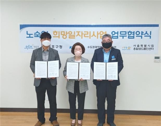 서울 영등포구는 ‘2022년 노숙인 일자리 창출 사업’을 추진하기 위해 지난 25일 한국철도공사, 옹달샘드롭인 노숙인 복지시설과 업무협약을 체결했다. 협약은 노숙인을 환경정비 인력으로 고용해 경제적 자립 역량을 키우고 영등포역 주변 쓰레기 난립 문제도 해결하기 위해 추진됐다. 사진은 협약식에서 관계자들이 기념촬영을 하는 모습. (사진제공=영등포구청)