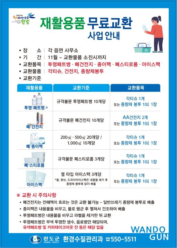 [완도=김우정 기자] 전남 완도군이 올바른 분리배출 문화를 확산시키기 위해 6일부터 연말까지 군민들을 대상으로 ‘재활용품 무료 교환’ 사업을 추진한다.