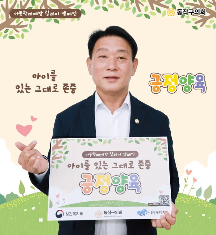 [시민일보 = 여영준 기자] 정재천 서울 동작구의회 의장이 최근 아동학대 예방을 위한 ‘아이를 있는 그대로 존중, 긍정양육’ 릴레이 캠페인에 동참했다.