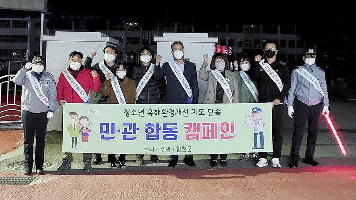 합천군(군수 문준희)은 2022학년도 대입수능시험을 마친 18일 경찰서, 교육청, 청소년 지도위원, 청소년상담복지센터 및 관계자 10여 명이 참여한 가운데 청소년 유해환경 지도단속 및 야간 배회 청소년 귀가 계도 합동캠페인을 실시했다.