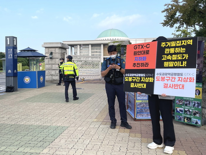 | ▲ 한 도봉 주민이 최근 국회 앞에서 GTX-C 노선 도봉 구간과 지상화 결사 반대 일인시위 중인 모습. (사진제공=도봉구청) |