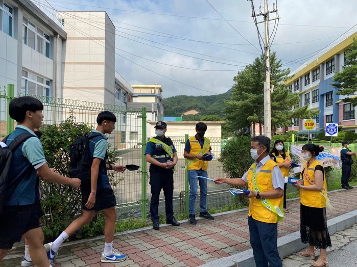 경기 포천시 일동면 청소년지도협의회가 최근 '학교폭력 없는 일동, 우정도 일등'이라는 슬로건으로 학교폭력 예방과 여름방학 중 학교폭력 근절 분위기 조성을 위한 캠페인을 전개했다. 사진은 등교하는 학생들에게 학교폭력 예방과 안전한 학교생활의 메시지를 담은 홍보물 등을 나눠주고 있는 모습. (사진제공=포천시청)
