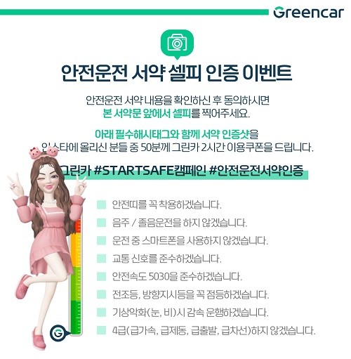 추가로 제페토에서 도로교통공단 부스를 활용한 SNS 이벤트도 진행한다. 도로교통공단 ‘Start Safe 안전운전서약’ 부스 앞에서 셀피를 촬영하고 그린카 인스타그램에 응모하면 추첨을 통해 총 50명에게 그린카 2시간 이용쿠폰을 지급하는 방식이다.