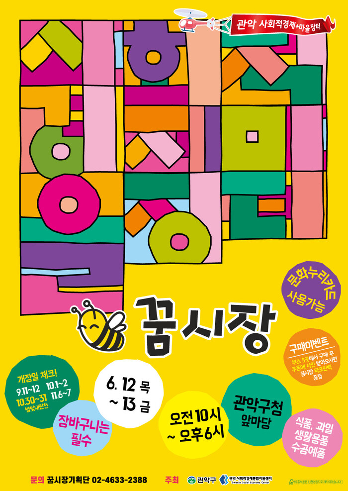 꿈시장 개장과 운영에 대한 자세한 사항은 관악구청 일자리벤처과로 문의하면 된다.