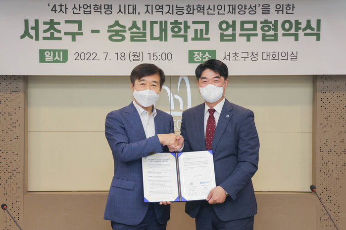 서울 서초구가 지난 18일 숭실대와 ‘지역지능화 혁신인재 양성을 위한 업무협약’을 체결했다. 구는 협약으로 ‘지역지능화 혁신인재 양성사업’을 본격 추진하며, 주요 내용은 지역내 기업 재직자에게 AI 석·박사 과정학비 지원해 교육하는 ‘재직자 석·박사과정 지원’ 등이다. 사진은 협약식에서 전성수 구청장(왼쪽)이 관계자와 기념촬영을 하는 모습. (사진제공=서초구청)