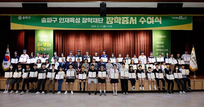 [시민일보 = 이대우 기자] 서울 송파구(구청장 서강석)가 출연기관인 재단법인 송파구인재육성장학재단을 통해 올해 상반기 장학생으로 선발된 60명 학생에게 장학증서를 수여했다. 지급 장학금은 총 6100만원이다.