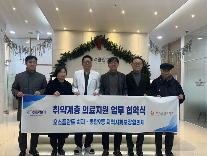 이날 협약식은 오스플란트치과에서 진행됐으며, 홍정의 동탄9동장, 이원대 동탄9동 지역사회보장협의체 부위원장, 김준형 오스플란트치과 원장 및 의료진, 협의체 위원들이 참석해 지역사회 의료복지 강화를 위한 상호 협력을 약속했다.