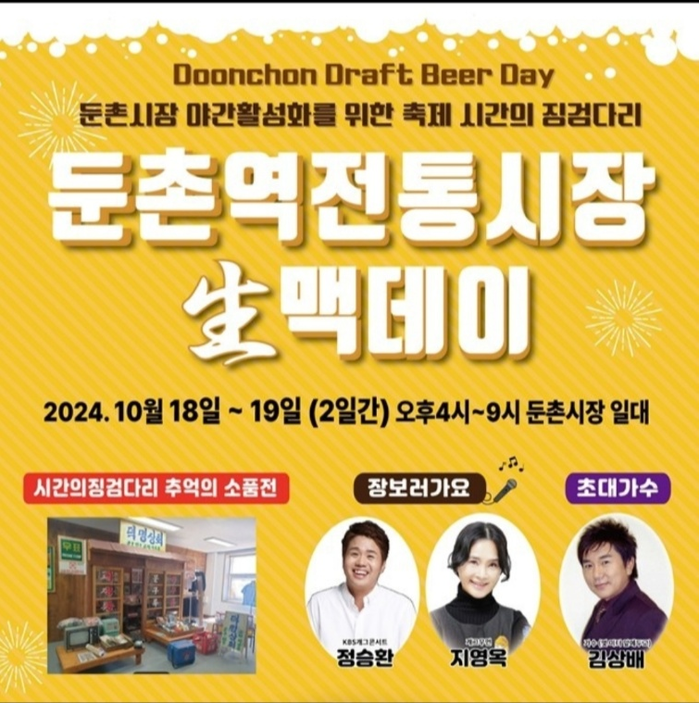 [시민일보 = 이대우 기자] 강동구(구청장 이수희)는 오는 18일부터 이틀간 둔촌역전통시장에서 ‘시간의 징검다리 生맥데이’ 야시장 축제를 개최한다고 전했다.
