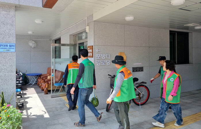 | ▲ 서대문구 홍은1동 자율방재단원과 새마을지도자협의회원들이 시설 점검과 수박 나눔을 위해 경로당을 방문하고 있다. (사진=서대문구청 제공) |