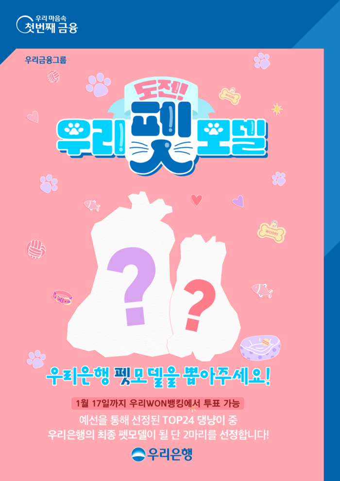 앞서 우리은행은 지난 11월 반려동물을 키우는 고객들을 대상으로 인스타그램과 우리WON뱅킹에서 펫모델을 선정하는 ‘도전! 우리펫모델’콘테스트를 실시한 바 있다.