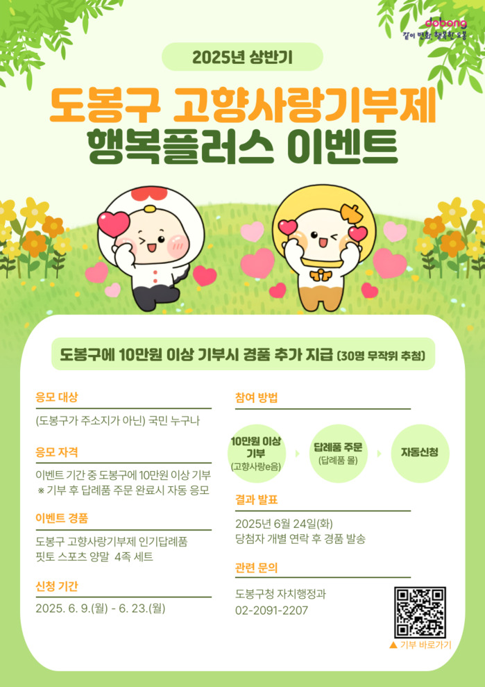 [시민일보 = 문민호 기자] 도봉구(구청장 오언석)가 오는 23일까지 구에 10만원 이상 기부한 국민을 대상으로 경품을 증정한다고 9일 밝혔다.