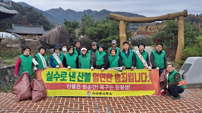 이날 행사에는 새마을협의회와 부녀회 회원 10여 명이 참여해 가야면을 찾는 관광객들에게 산불예방의 중요성을 알리는 홍보 활동을 진행했다. 또한, 등산로 곳곳에 쌓인 낙엽과 쓰레기를 치우며 환경 정비에 힘썼다.