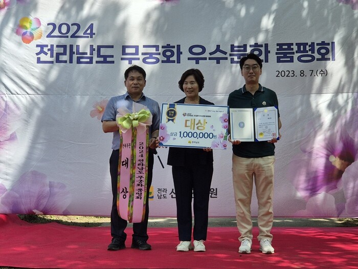 | ▲ 무궁화 품평회 대상 수상 (좌로부터 김보성 산림공원과장, 오득실 전남 산림연구원 원장, 한진규 공원녹지팀장)./ 해남군 제공 |