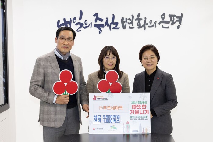 [시민일보 = 이대우 기자] 서울 은평구(구청장 김미경)는 최근 ㈜푸르네마트와 함께 따뜻한 겨울나기 사랑의 이웃돕기 성금 및 성품 전달식을 가졌다고 밝혔다.