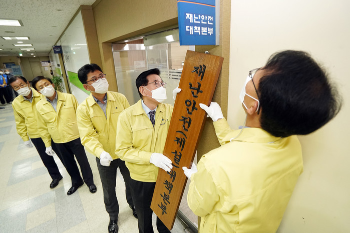 서울 동대문구는 15일 ‘2021·2022년 겨울철 제설대책’을 추진하기 위한 재난안전대책본부의 개소식을 개최했다. 구는 강설시 신속한 제설로 구민의 불편을 최소화하기 위해 총력을 다하고 기상상황에 맞춘 탄력적인 비상단계 발령으로 선제적 대응 역량을 강화한다. 사진은 유덕열 구청장(오른쪽 두 번째)이 현판식을 하고 있는 모습. (사진제공=동대문구청)