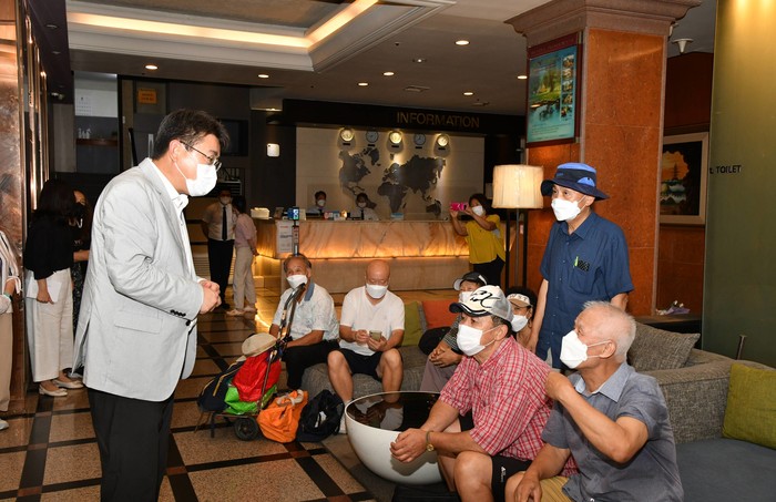 오승록 서울 노원구청장이 최근 지역내 관광호텔에 마련된 '어르신 야간 무더위쉼터'를 방문했다. 이날 오 구청장은 현장을 살피며 지역 노인들의 불편함을 살폈다. 사진은 이날 오 구청장(왼쪽)이 지역내 노인들과 인사를 나누며 이야기를 나누고 있는 모습. (사진제공=노원구청)