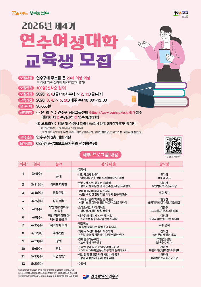 [인천=문찬식 기자] 인천 연수구(구청장 이재호)는 지역 여성의 지속 가능한 성장과 사회참여 역량 강화를 위해 ‘제4기 연수 여성대학’ 교육생을 오는 6일부터 13일까지 선착순 모집한다.