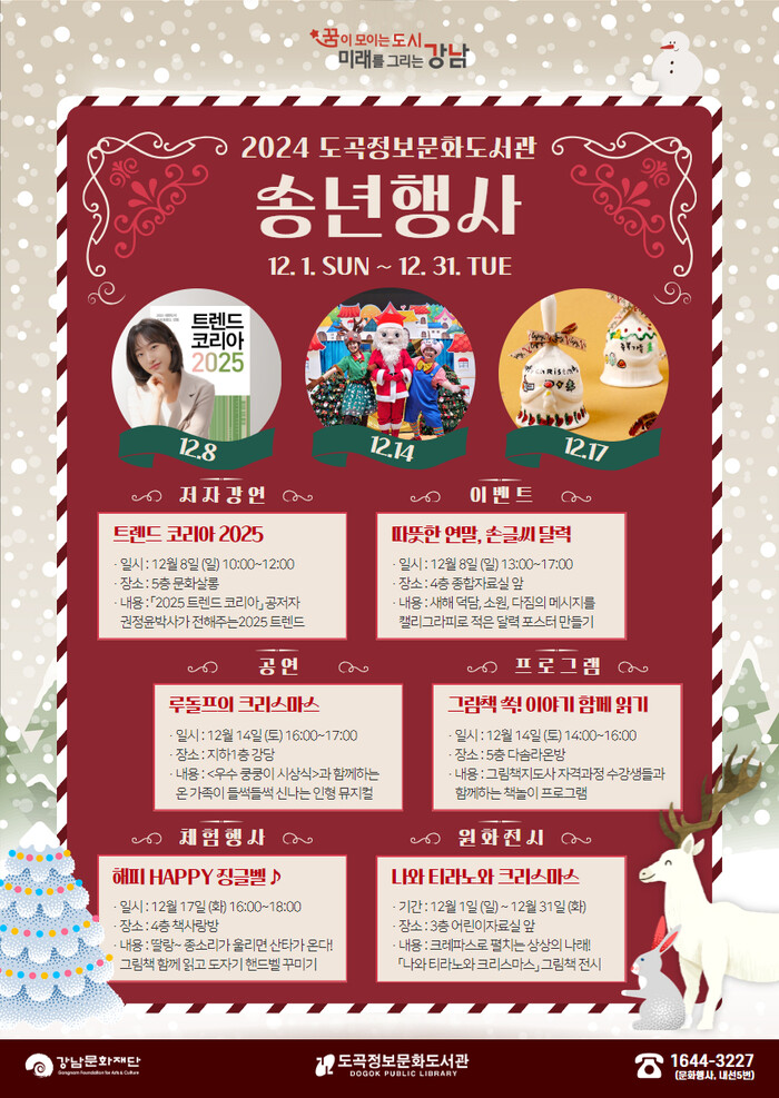 [시민일보 = 이대우 기자] (재)강남문화재단(이사장 이자연)에서 운영하는 도곡정보문화도서관에서 <2024 송년행사>를 개최한다.