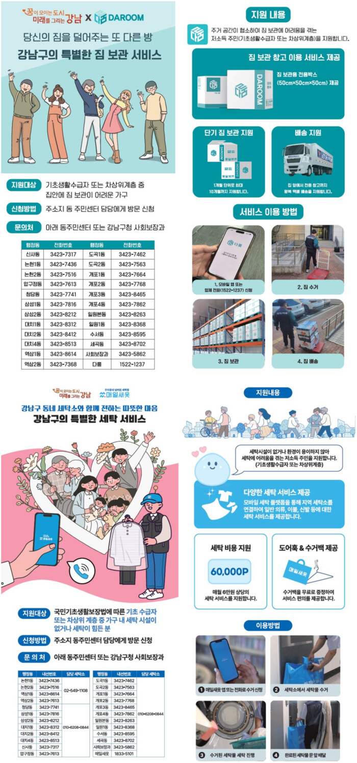 조성명 구청장은 “지난해 높은 만족도를 보였던 세탁, 짐 보관 서비스를 올해도 꾸준히 운영함으로써 취약계층 주민들의 주거환경을 개선하겠다”며 “앞으로도 작지만 실질적인 변화를 만들어 내는 생활 밀착형 정책을 발굴해 더 살기 좋은 강남을 만들어 가겠다”고 밝혔다.