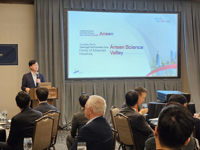 | 기업도시 안산 이민근 시장이 미 테네시주 네슈빌서 투자유치 설명회를 하고 있다. 사진제공=안산시 |