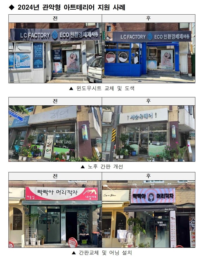 구는 소상공인 점포 경쟁력을 강화해 방문 고객을 늘리고자 2019년부터 매년 아트테리어 사업을 추진해왔으며, 현재까지 총 2073곳의 점포가 개선됐다.