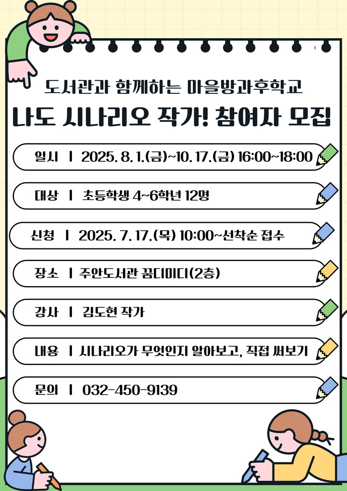 [인천=문찬식 기자] 인천광역시교육청주안도서관(관장 최문정)은 8월 1일부터 10월 17일까지 초등학교 고학년을 대상으로 마을방과후학교 프로그램 ‘나도 시나리오 작가’를 운영한다.