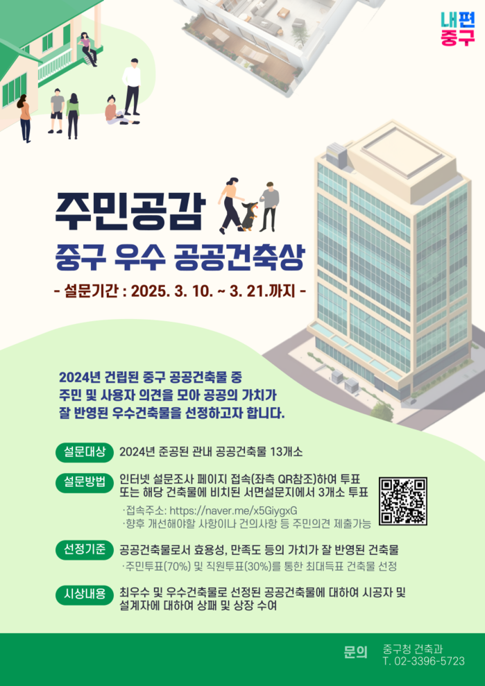 최종 점수는 주민 투표(70%)와 중구청 직원 투표(30%)를 합산해 결정되며, 가장 높은 점수를 받은 2개 건축물이 최우수상과 우수상을 수상하게 된다.