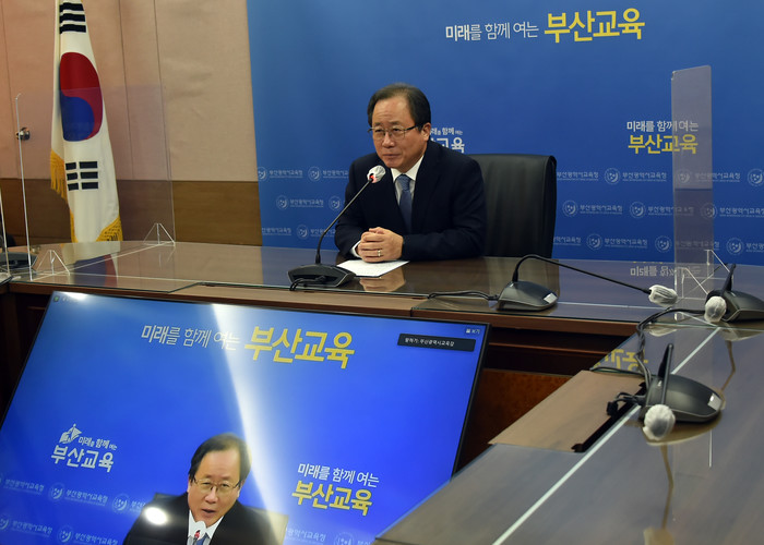 김석준 부산광역시교육감이 11일 오후 2시 시교육청에서 초·중·고·특수학교 정보부장 및 관계자들이 ZOOM(줌)으로 참여한 가운데 열린‘2022년 부산 교육정보화 추진계획 설명회’에서 인사말를 하고 있다.