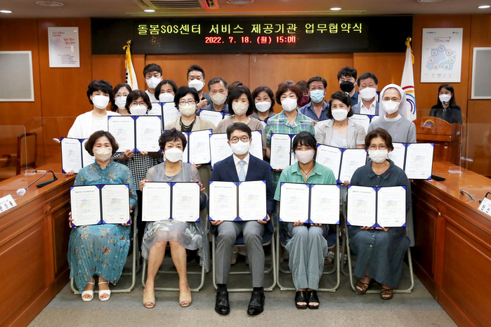 서울 성동구가 지난 18일 '돌봄SOS센터' 사업을 위해 지역내 돌봄서비스 제공기관과 민·관 협력 업무협약을 체결했다. 협약 대상기관은 신규 3곳을 포함해 최종 선발된 26곳이며, 재가장기요양기관 등 일시재가 18곳, 요양원 등 단기시설 3곳, 동행·주거·식사지원 서비스 제공기관 5곳이다. 사진은 정원오 구청장(앞줄 가운데)과 관계자들이 기념촬영을 하는 모습. (사진제공=성동구청)