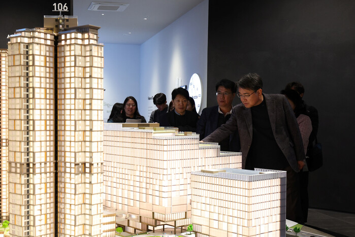 | ▲ 오승록 구청장(오른쪽)이 서울원 아이파크 갤러리(견본주택)에 방문해 관계자들과 광운대역세권 개발 현황 점검 및 향후 구체화 방향을 논의하고 있다. (사진=노원구청 제공) |