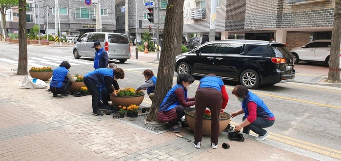 경기 의정부시 흥선동행정복지센터는 최근 흥선로 일대 흥선동 행정복지센터~가능지구대 구간에서 아름다운 흥선마을 만들기를 위해 메리골드 등 봄꽃 2000여본을 60개 화분에 식재했다. 사진은 이날 봉사자들이 화분에 봄꽃을 식재하고 있는 모습. (사진제공=의정부시청)