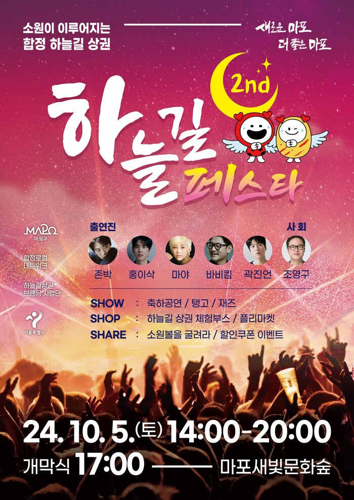 [시민일보 = 문민호 기자] 서울 마포구(구청장 박강수)는 오는 5일 마포새빛문화숲 잔디광장과 하늘길 상권에서 ‘제2회 하늘길 페스타’를 개최한다.