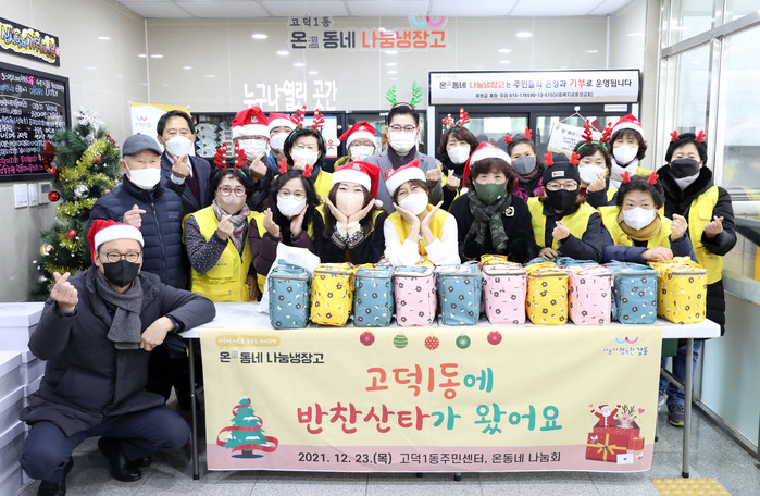 서울 강동구 고덕1동은 최근 복지통장으로 구성된 ‘똑똑살피미 봉사단’이 크리스마스 산타가 돼 복지 사각지대에 있는 결식우려 대상자들의 안부를 확인하며 반찬을 전달하는 크리스마스 행사를 열었다. 사진은 이날 이정훈 구청장(뒷줄 가운데)이 봉사자들과 함께 기념촬영을 하는 모습. (사진제공=강동구청)