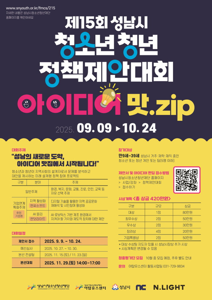 [성남=오왕석 기자] 성남시청소년청년재단(대표이사 양경석) 야탑유스센터는 청소년과 청년이 지역사회 문제를 발굴하고 해결방안을 제시하는 제15회 성남시청소년청년정책제안대회 ‘아이디어 맛.zip’접수를 진행 중이라고 밝혔다. 대회 접수는 10월 24일까지 온라인으로 이뤄진다.