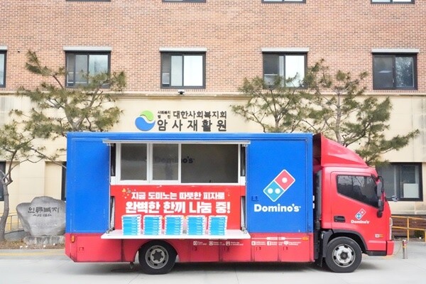 도미노피자는 지난 13일 대한사회복지회에서 운영 중인 암사재활원의 중증장애인 및 직원 100여 명에게 푸드트럭 파티카를 통해 피자를 전달했다.