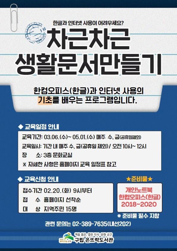 [시민일보 = 이대우 기자] 서울 은평구(구청장 김미경)는 구립 은뜨락도서관에서 컴퓨터를 활용한 문화 프로그램 ‘차근차근 생활문서 만들기’을 운영한다고 밝혔다.