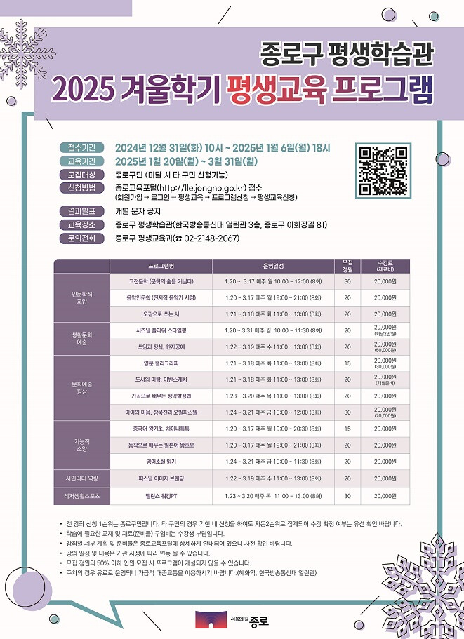 [시민일보 = 이대우 기자] 종로구(구청장 정문헌)가 이달 31일부터 2025년 1월 6일 18시까지 「2025년 겨울학기 평생교육 프로그램」 수강 신청을 접수한다.