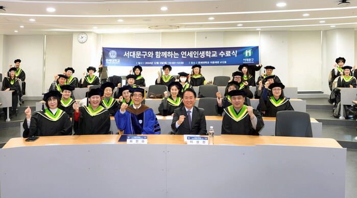 | ▲ 이성헌 서대문구청장(앞줄 오른쪽 두 번째)과 허현승 연세대학교 미래교육원 원장(앞줄 오른쪽 세 번째)이 지난해 ‘서대문구 9개 대학 연합 행복캠퍼스’ 사업 중 ‘연세인생학교’ 과정 수료자들과 함께 기념 촬영을 하고 있다. (사진=서대문구청 제공) |