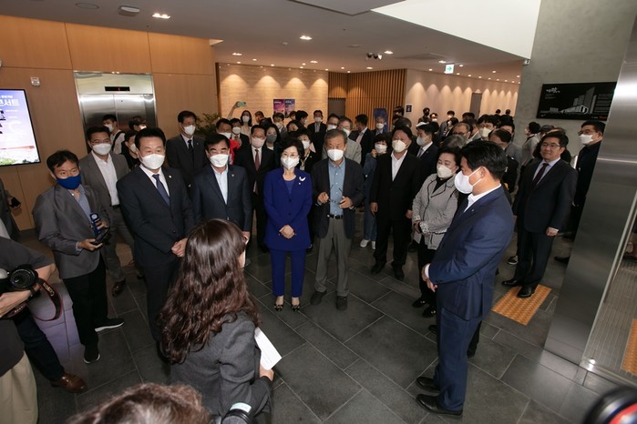 최성운 경기 부천시의회 의장이 최근 부천아트센터 준공식에 참석해 관계자들의 노고를 격려하고, 소공연장, 부천필 연습실, 콘서트홀 등 주요 공간을 시설을 둘러봤다. 사진은 시설에 대한 설명을 듣고 있는 최 의장과 관계자들의 모습. (사진제공=부천시의회)