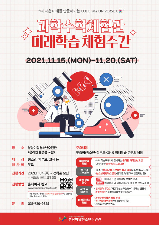 분당야탑청소년수련관 김진명 관장은 “이번 미래학습체험주간을 통해 미래사회를 선도 할 청소년들에게 디지털 격차 및 학습격차가 없도록 지원하며, 지역 내 융합교육 협업을 통해 모두가 성장할 수 있는 청소년과학수학관을 운영하겠다”라고 밝혔다.