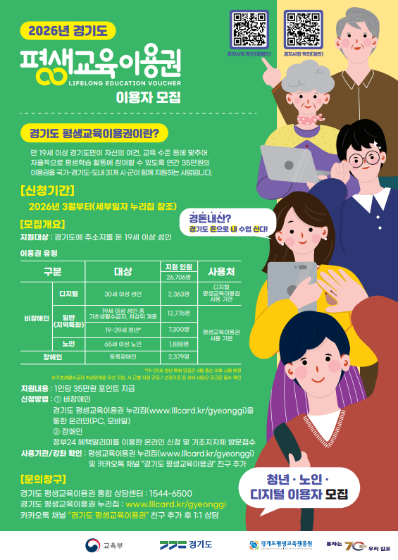 신청기간은 11일부터 31일까지이며, 장애인 평생교육이용권은 정부24를 통해, 그 외 평생교육이용권은 경기도 평생교육이용권 사이트 또는 모바일 웹을 통해 온라인으로 신청할 수 있다.