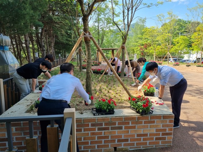 경기 의정부시 맑은물사업소는 민원인들과 시민들에게 친환경 힐링공간을 제공하기 위해 사업소내 시민 쉼터를 녹지공간으로 정비하고 있다. 사진은 최근 사업소 관계자들이 화단에 꽃을 심고 있는 모습. (사진제공=의정부시청)