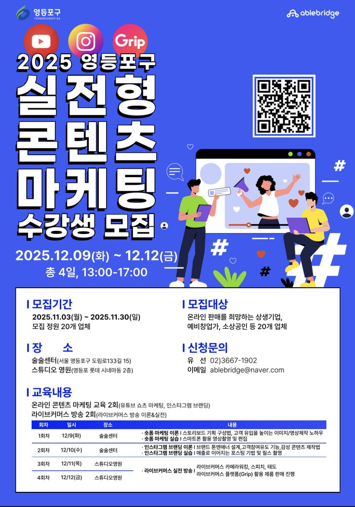 온라인 마케팅 교육은 오는 12월9일, 10일 이틀간 술술센터에서 진행된다. ▲짧은 영상(숏폼) 구성 기획법 ▲고객 유입을 높이는 영상 제작법 ▲브랜드 이미지 설계법 ▲매출로 이어지는 온라인 게시 기법 등 실전 중심의 교육이 이뤄지며 실습을 통해 실무 적용 능력을 높일 예정이다.