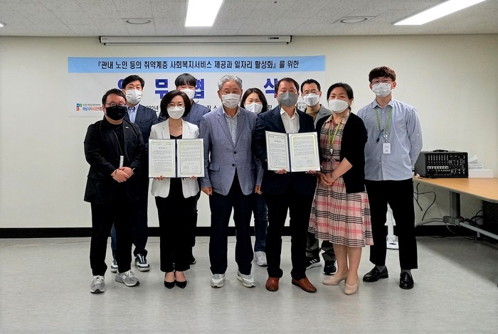 경기 하남시미사강변종합사회복지관은 하남시니어클럽과 8일 지역내 노인 등 취약계층 사회복지서비스 제공과 일자리 활성화를 위한 업무협약을 체결했다. 협약을 통해 지역내 일자리 창출과 안전한 일자리 활동 지원에 관한 포괄적인 내용과 세부적인 계획이 함께 협의됐다. 사진은 협약식에서 관계자들이 기념촬영을 하는 모습. (사진제공=하남시청)